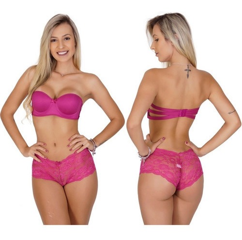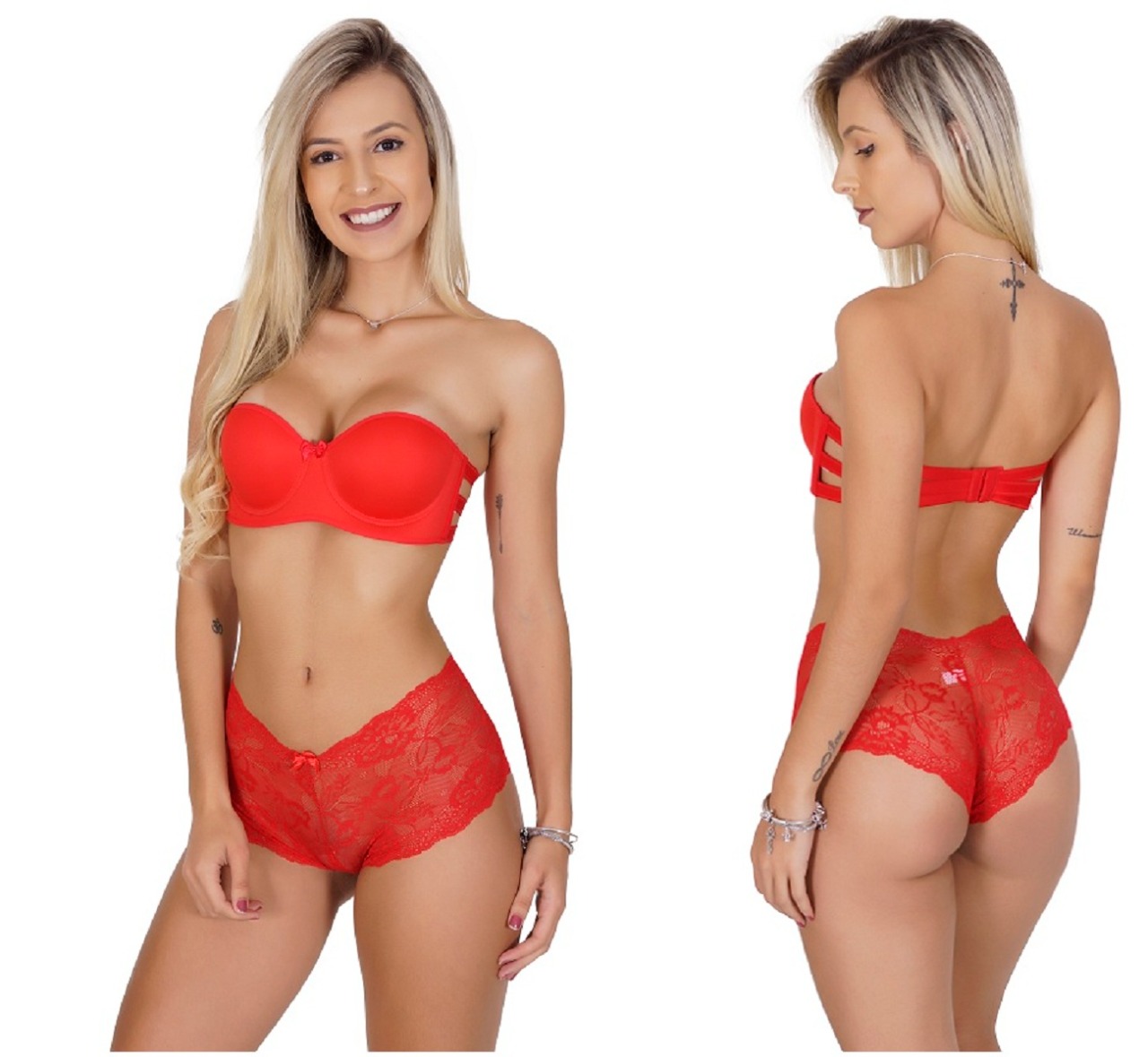 Conjuntos composto por sutia tomara que caia e calcinha modelo shortinho de renda.