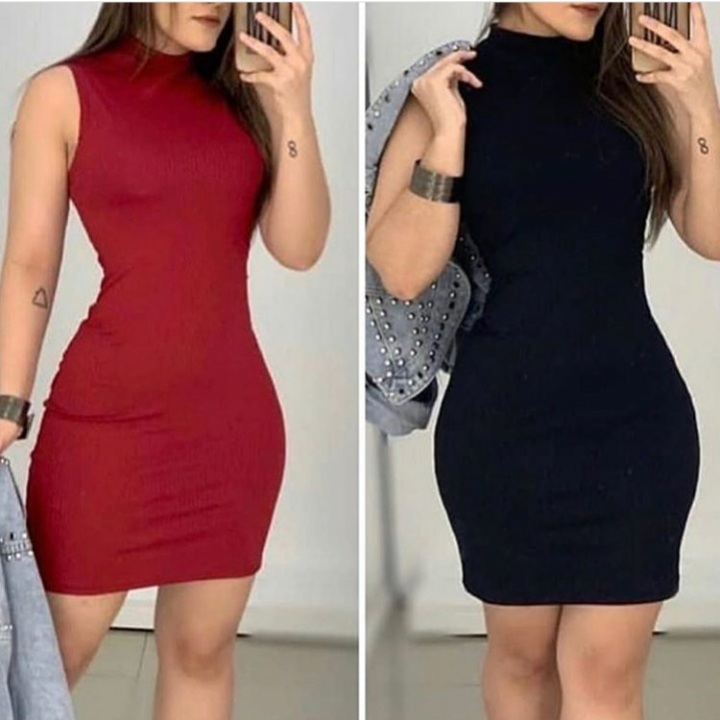 vestido feminino tubinho gola alta manga cavada tecido com elastano estilo fashion